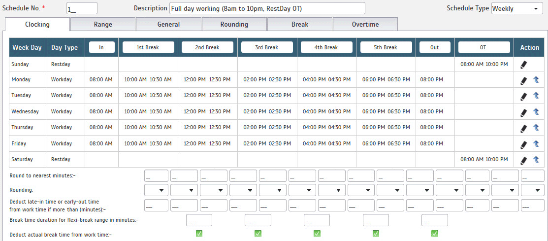 Provides daily, weekly, and flexible clocking schedules to support normal, overnight and multiple shifts configuration.